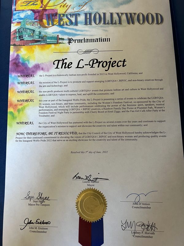 The L-Project Los Angeles is a historically lesbian non-profit 501(c)3 organization in service to promote, support, and inspire emerging LGBTQIA + BIPOC women and non-binary creatives through the arts and technology.